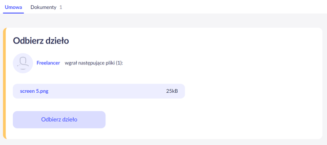 Freelancer skończył pracę. Sprawdź pliki, które dodał i zaakceptuj je. Jeśli coś jest niezgodne z Waszą umową, możesz odrzucić pliki.