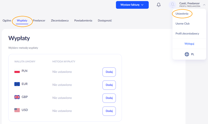 Metodę wypłaty wybierasz w ustawieniach. Zaloguj się, najedź na swój awatar w prawym górnym rogu i wejdź w Ustawienia → Wypłaty. Zobaczysz cztery waluty do wyboru: PLN, EUR, GBP i USD. Możesz rozliczać się z klientem w każdej z nich, ale musisz mieć dodaną do niej metodę wypłaty.